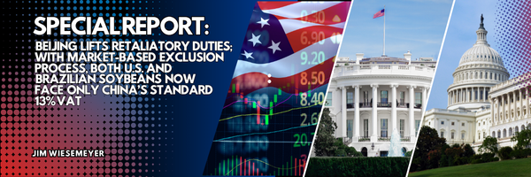 Beijing lifts retaliatory duties; with market-based exclusion process, both U.S. and Brazilian soybeans now face only China’s standard 13% VAT