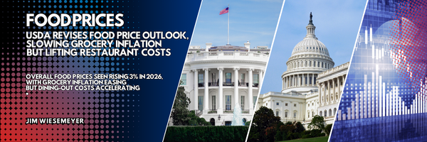 USDA made notable revisions to its food price outlook, projecting overall food prices to rise 3% in 2026, compared with 2.5% in 2025, while signaling a meaningful split between grocery and restaurant inflation. According to USDA’s Economic Research Service (ERS), grocery prices are now expected to rise a more modest 1.7%, down from 2.3% in 2025, while food away from home — restaurants and foodservice — are forecast to jump 4.6%, accelerating from 3.8% last year.